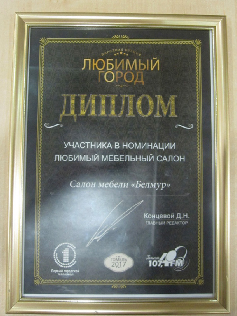 Рады сообщить Вам, что салон мебели "Белмур" становится победителем II городской народной премии "Любимый город - 2016" в номинации "Любимый мебельный салон"! |